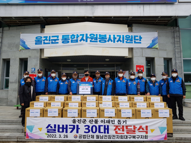 대한민국월남전참전자회 대구북구지회(지회장 정덕주)는 26일 울진군체육관에서 운영위원회 임원진 및 회원들이 참석한 가운데 울진 산불 이재민 돕기 위문품으로 실버카 30대를 전달했다.