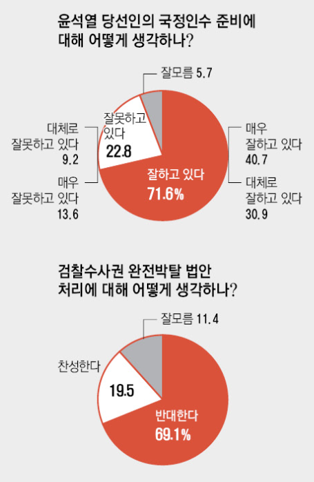 매일신문이 대경미래발전포럼과 공동으로 한길리서치에 의뢰해 지난 16~17일 대구에 사는 만 18세 이상 유권자 1천3명을 상대로 진행한 여론조사(표본오차는 95% 신뢰수준에 오차범위 ±3.1%포인트) 결과, 윤 당선인의 국정인수 준비에 관해 응답자 71.6%가 긍정적으로 답했으며 22.8%는 부정적으로 보는 것으로 나타났다.