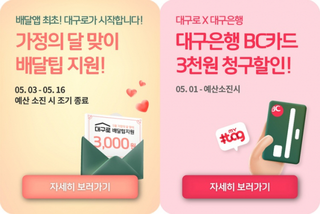 대구형 공공 배달앱 '대구로'는 이달 소중한 사람에게 감사하는 마음을 전하자는 뜻에서 배달팁 지원, BC카드 청구 할인 이벤트를 추진한다. 3일부터 2주 간 배달팁 할인(건당 최대 3천원) 이벤트를 진행한다. 대구은행과 제휴, 지난달 29일부터 '주문은 대구로 카드는 대카로' 할인 행사도 실시 중이다. 이월드 신규 연간 회원 가입자에겐 대구로 5천원 할인 쿠폰을 지급한다.