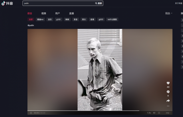 더우인에서 푸틴의 이름만 입력하면 친(親)푸틴 동영상을 쉽게 찾을 수 있으며, '푸틴의 잘생긴 순간' 등 수많은 연관 검색어가 나온다.