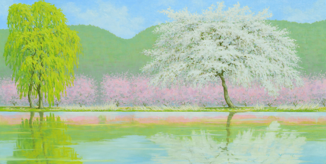 이경정, 능수버들과 벚꽃, 150cmx75cm, oil on canvas.