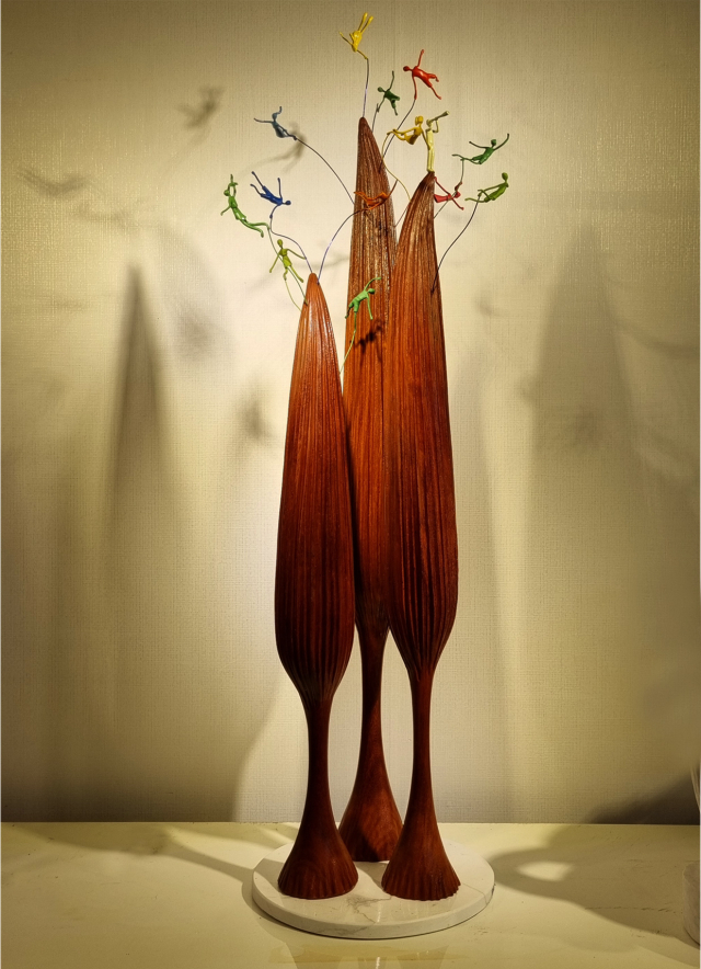 방준호, 3, fly in the sky, wood, bronze, 30x30x85cm.