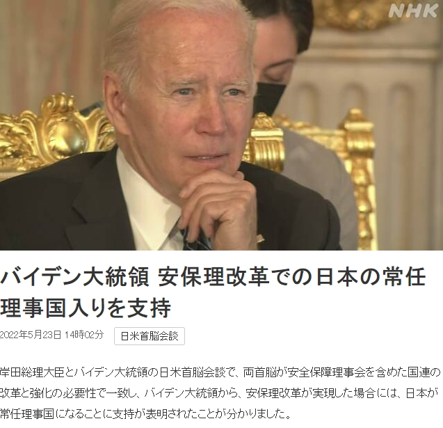 23일 일본을 방문 중인 조 바이든 미국 대통령이 일본의 유엔(UN, 국제연합) 안전보장이사회(안보리) 상임이사국 진출을 지지한다는 뜻을 밝혔다.