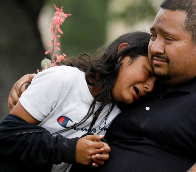 24일(현지시간) 미국 텍사스주 소도시 유밸디의 롭 초등학교에서 무차별 총기 난사 사건이 발생한 후 가족 재회 장소인 인근 시민회관 밖에서 한 아이가 가족 품에 안긴 채 눈물을 흘리고 있다. 연합뉴스
