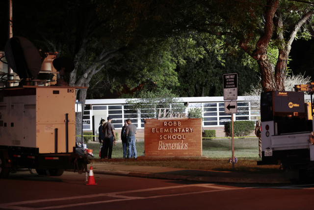 24일(현지시간) 미국 텍사스주의 소도시 유밸디에 있는 롭 초등학교 무차발 총기 난사 사건 현장에 출동한 경찰관들이 수사에 나서고 있다. 그레그 애벗 텍사스 주지사에 따르면 최소 18명의 어린이와 2명의 성인이 숨졌다. 범행을 저지른 유밸디의 고등학생 샐버도어 라모스(18)는 현장에서 진압 요원의 총에 맞아 사망했다. 연합뉴스