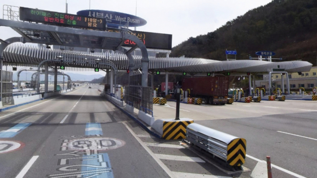 지난 4일 전기차 아이오닉5 화재 사고로 탑승자 2명이 숨진 부산 강서구 남해고속도로 서부산요금소 현장 모습. 가운데는 하이패스 게이트 주변에 설치된 충격흡수대와 도로분리벽. 네이버 지도
