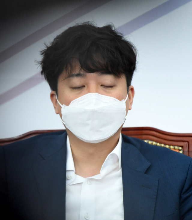 국민의힘 이준석 대표(가운데)가 지난 16일 오전 서울 여의도 국회에서 열린 최고위원회의에 참석해 눈을 감고 앉아 있다. 연합뉴스