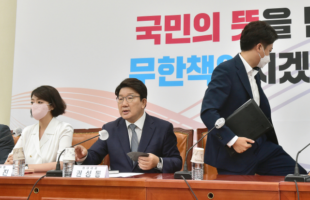 국민의힘 권성동 원내대표가 20일 서울 여의도 국회에서 열린 최고위원회의에서 비공개회의 현안 논의 문제를 놓고 이준석 대표가 배현진 최고위원과 논쟁을 벌인 뒤 회의장을 나가자 회의를 비공개로 전환하고 있다. 연합뉴스