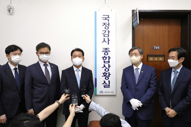 이광재 국회 사무총장이 29일 오전 국회 의사과 앞에서 열린 국정감사 종합상황실 현판식에서 인사말을 하고 있다. 연합뉴스