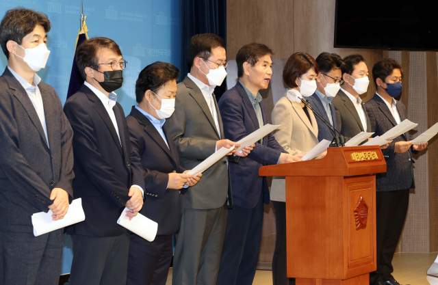 3일 오전 국회 소통관에서 더불어민주당 윤석열 3일 오전 국회 소통관에서 청와대출신 더불어민주당 국회의원들이 감사원의 문재인 전 대통령 서면조사에 대한 규탄 기자회견을 하고 있다. 연합뉴스