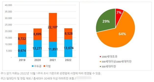 11월 입주 물량 연도별 추이(왼쪽)와 2022년 11월 입주 물량 규모별 비중. 직방 제공