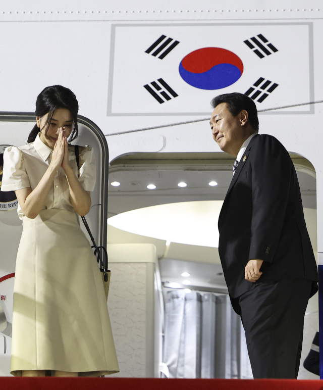 윤석열 대통령과 김건희 여사가 한·아세안 정상회의 등의 일정을 마친 뒤 주요 20개국(G20) 정상회의가 열리는 인도네시아 발리로 출국하기 위해 13일(현지시간) 캄보디아 프놈펜국제공항에 도착, 공군 1호기에서 인사하고 있다. 연합뉴스