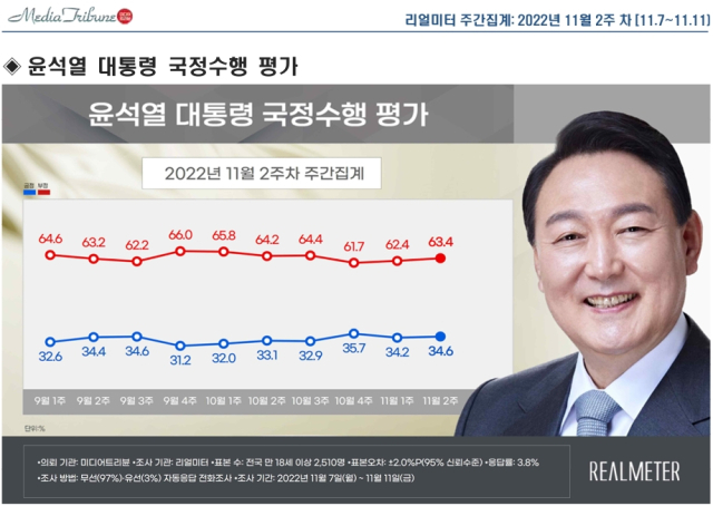 ▶리얼미터에 따르면 윤석열 대통령 국정수행 부정평가는 10월 4주 61.7%에서 11월 1주(지난주) 62.4%, 이번 11월 2주 63.4%로 상승했다.