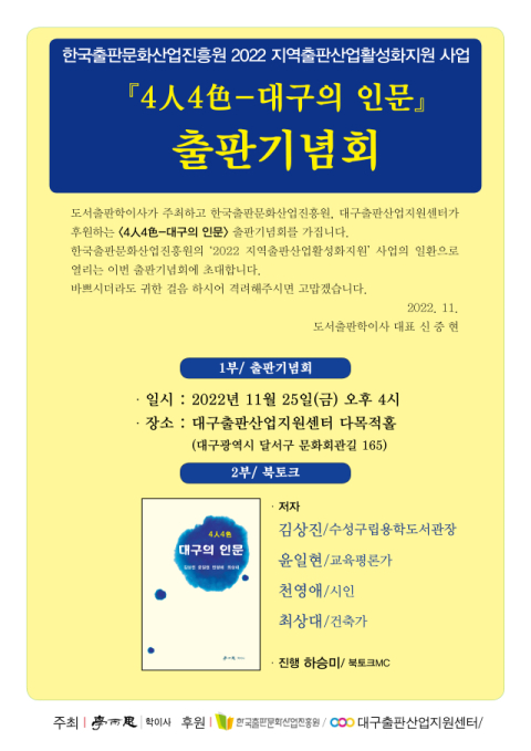 도서출판 학이사는 25일 오후 4시 대구출판산업지원센터 다목적홀에서 '4인 4색-대구의 인문' 출판기념회를 겸한 북토크를 연다.