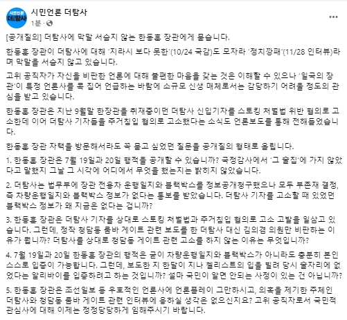 ▶더탐사는 28일 오후 1시 52분쯤 페이스북에 '더탐사에 막말 서슴지 않는 한동훈 장관에게 묻습니다'라는 제목의 글을 올려 "한동훈 장관이 더탐사에 대해 '지라시 보다 못한'(10월 24일 국감)도 모자라 '정치깡패'(11월 28일 인터뷰)라며 막말을 서슴지 않고 있다"며 "고위 공직자가 자신을 비판한 언론에 대해 불편한 마음을 갖는 것은 이해할 수 있으나 '일국의 장관'이 특정 언론사를 콕 집어 언급하는 바람에 소규모 신생 매체로서는 감당하기 어려울 정도의 관심을 받고 있다"고 밝혔다.