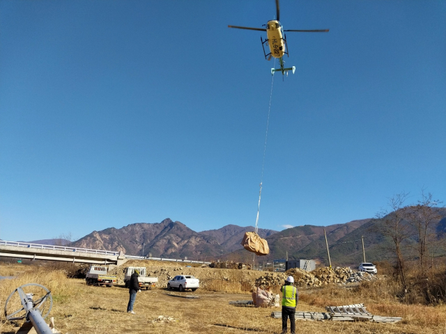 사고 헬기 비상착륙 직전 모습. 문경 봉명산 인근의 문경시 발주 산림공사 현장에서 나온 폐기물을 밧줄에 묶어 이동하는 장면이다. 문경 산림당국 제공