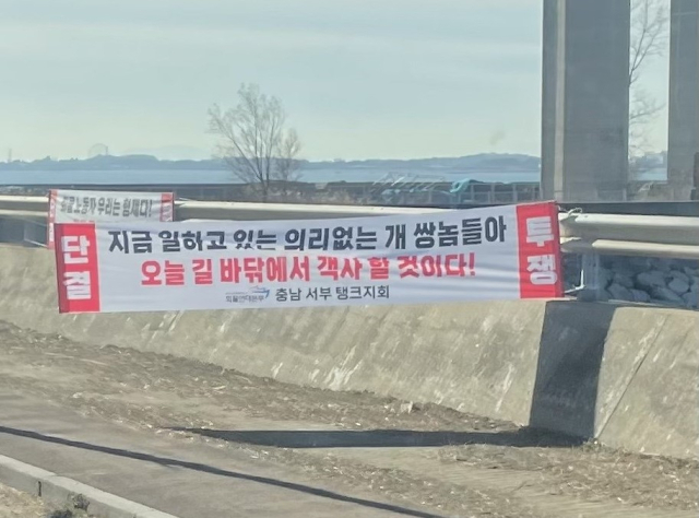 5일 한 온라인커뮤니티에는 화물연대의 플래카드 문구를 찍은 사진이 올라왔다. 화물연대 충남 서부 탱크지회 이름으로 내걸린 플래카드에는 "지금 일하고 있는 의리 없는 XX놈들아. 오늘 길바닥에서 객사할 것이다"라는 내용이 담겼다. 파업에 참여하지 않은 비조합원을 향한 경고 문구로 풀이된다.