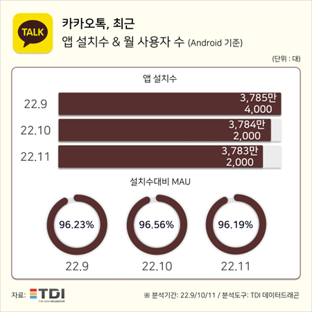 카카오톡 앱 설치수는 ▲9월 3785만 4,000대 ▲10월 3784만 2,000대 ▲11월 3783만 2,000대로 집계됐다. 9월 대비 11월 앱 설치수는 2만 2,000대 감소했다.