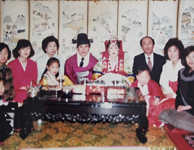 이현지 씨의 외삼촌 결혼식 때 가족이 모여 촬영한 사진. 왼쪽 세번째가 외할머니 고 박잠선 씨고 박 씨 앞 어린아이가 어린 시절의 이현지 씨. 가족 제공.