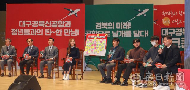 8일 구미 경운대학교에서 열린 '청년들과 함께 Talk 까놓고 이야기하는 대구경북신공항 토크콘서트'에 참여한 학생들이 신공항 홍보 영상을 보며 박수치고 있다. 이번 행사는 경북도가 청년들에게 통합신공항을 통한 비전 제시와 청년들과의 공감대 형성을 위해 마련했다.우태욱 기자 woo@imaeil.com