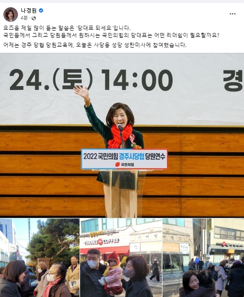 나경원 전 의원은 25일 오후 1시 58분쯤 자신의 페이스북에 최근 근황을 전하는 사진들을 올리고는 "요즈음 제일 많이 듣는 말씀은 '당 대표 되세요'"라면서 "국민들께서 그리고 당원들께서 원하시는 국민의힘의 당 대표는 어떤 리더십이 필요할까?"라고 물었다.