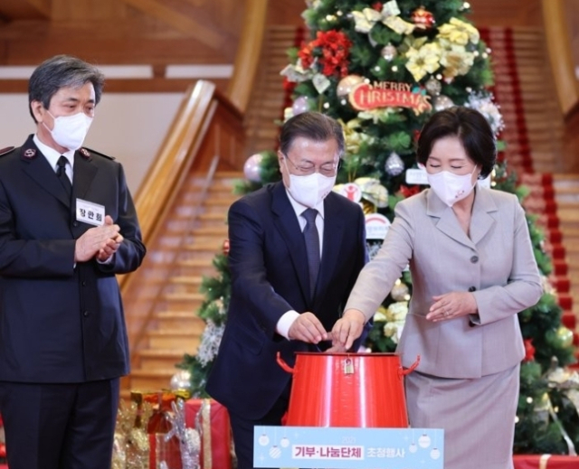 지난 2021년 12월 3일 문재인 전 대통령과 김정숙 여사가 청와대에서 열린 '2021 기부·나눔단체 초청행사'에 참석, 구세군 모금함에 성금을 넣고 있다. 연합뉴스