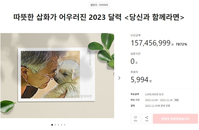 이 달력 제작비·배송비를 제외한 수익금은 유기견 보호단체 '꼬순내 지킴이'와 '유기견 없는 도시' 2곳으로 기부될 것으로 알려졌는데, 해당 크라우드 펀딩은 지난 12월 8~18일 1억5천745만6천999원을 모았다. 이는 목표 금액 200만원의 7872%였다.