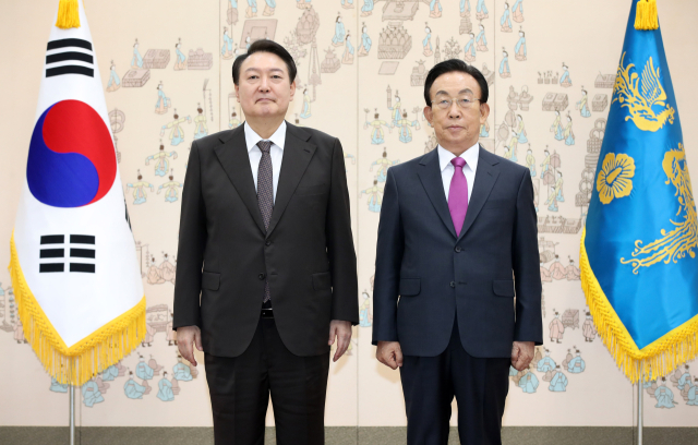 윤석열 대통령이 지난 10월 11일 오전 서울 용산 대통령실 청사에서 김관용 민주평화통일자문회의 수석부의장에게 임장을 수여한 뒤 기념촬영을 하고 있다. 연합뉴스