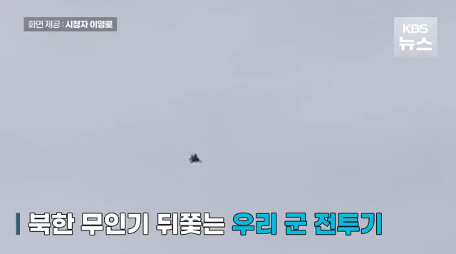 북한 무인기가 2017년 이후 처음으로 우리 영공을 침범해 서울 상공까지 침투했다. 격추에 나선 군의 대응 작전으로 인천국제공항과 김포공항의 민항기가 한때 이륙이 중단되는 초유의 사태가 발생했다. 합동참모본부에 따르면 26일 오전 10시 25분께부터 경기도 일대에서 북한 무인기로 추정되는 미상 항적 수 개가 포착됐다. 사진은 이날 김포 상공에서 북한 무인기를 뒤쫓는 우리 군 전투기. 연합뉴스