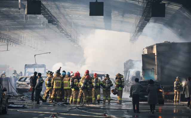 29일 오후 경기도 과천시 제2경인고속도로 과천지식정보타운 부근 방음터널 구간에서 화재가 발생해 소방관들이 분주하게 움직이고 있다. 연합뉴스