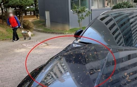 주차되어 있던 주민 B 씨의 제네시스 G80은 감 상자를 맞고 그대로 파손됐다. B 씨의 차량 앞 유리 보닛과 바퀴 덮개 등이 찌그러졌다.