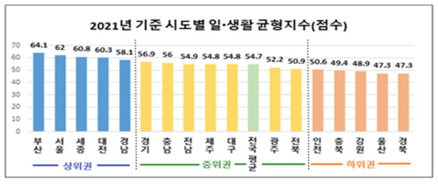 고용노동부는 전국 17개 시도별 '2021년 지역별 일·생활 균형지수'를 11일 발표했다.