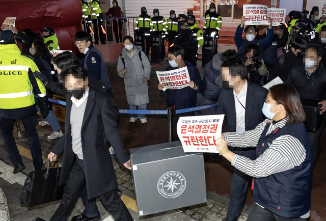 국가정보원이 18일 오후 서울 중구 전국민주노동조합총연맹(민주노총) 서울 사무실 압수수색을 마친 후 압수물이 든 상자를 들고 나가고 있다. 연합뉴스
