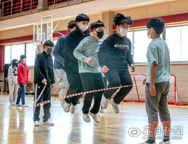 27일 오전 대구 동구 효동초등학교 강당에서 체육 수업에 참여한 학생들이 마스크를 착용한 채 단체 줄넘기를 하고 있다. 이날 교육부가 발표한 학교 내 마스크 착용 세부 지침에 따르면 합창 수업 및 실내 입학식 졸업식 등 다수가 밀집한 상황에서는 착용이 권고 된다. 안성완 기자 asw0727@imaeil.com