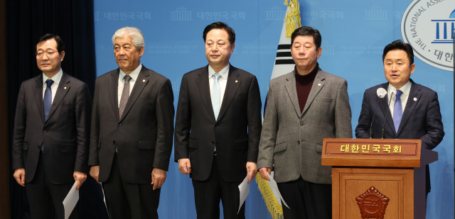 더불어민주당 부산·울산·경남 국회의원과 시도당위원장들이 31일 오전 서울 여의도 국회 소통관에서 윤석열 정부와 국민의힘의 가덕신공항 홀대를 좌시하지 않겠다는 내용의 기자회견을 하고 있다. 왼족부터 민홍철, 이상헌, 김두관, 박재호, 최인호 의원. 연합뉴스