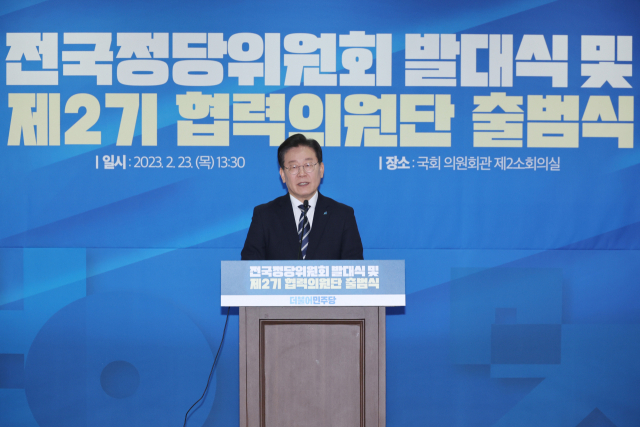 이재명 더불어민주당 대표가 23일 국회에서 열린 전국정당위원회 발대식 및 2기 협력의원단 출범식에서 축사하고 있다. 연합뉴스