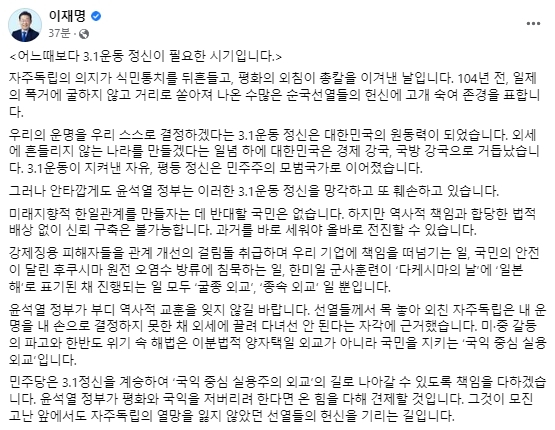 이재명 더불어민주당 대표가 삼일절을 맞아 올린 페이스북 글을 통해 "윤석열 정부가 3.1 운동 정신을 망각하고 훼손하고 있다"고 꼬집었다.