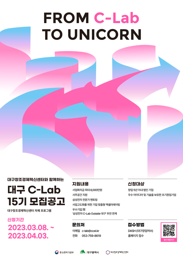 대구창조경제혁신센터는 대구시와 함께 '대구 C-Lab 액셀러레이팅 15기' 참여 기업을 모집한다고 13일 밝혔다.