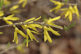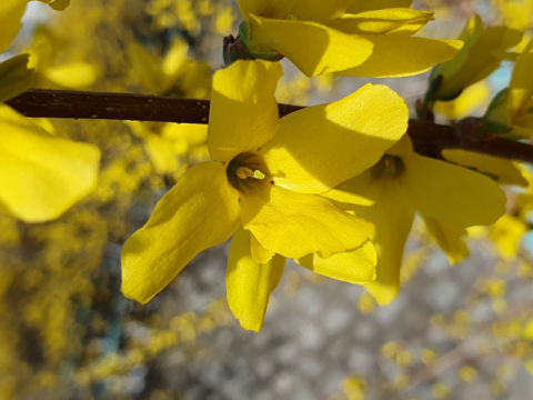 개나리는 잎이 나오기 전에 3월 중순 무렵 잎눈이 있는 겨드랑이에서 노란색 꽃이 1~3개씩 먼저 피며 꽃잎은 네 갈래의 통꽃으로 끝이 깊게 갈라진다. 수술은 2개이고 암술은 1개다.