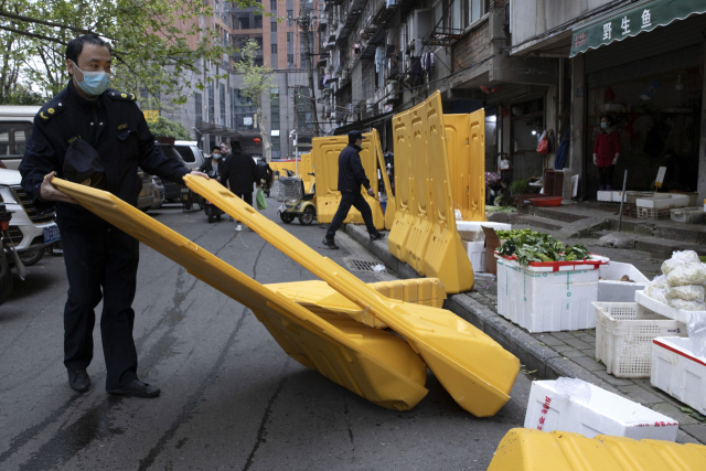 신종 코로나바이러스 감염증(코로나19) 발원지인 중국 우한에서 봉쇄 해제를 사흘 앞둔 5일 시청 공무원이 통행 차단 바리케이드를 치우고 있다. 연합뉴스