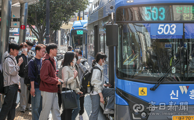 지난 20일 오후 대구 시내의 한 버스정류장에서 시민들이 버스를 탑승하기 위해 줄지어 서 있다. 매일신문DB