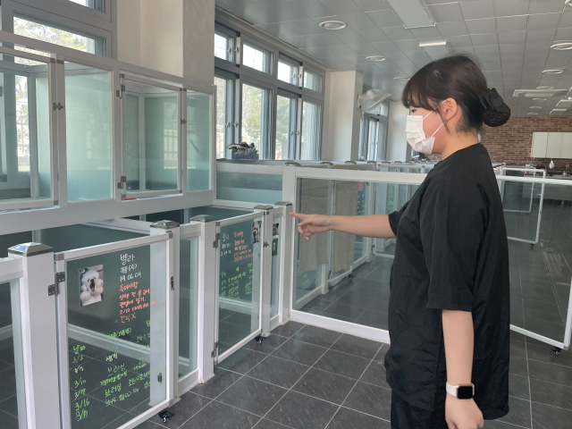 신하늘 학생이 교내 동물들이 지내는 사육장을 소개하고 있다. 한국 펫고에는 강아지 30마리와 고양이 2마리가 산다. 임소현 기자