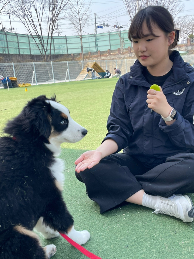 신하늘 학생이 훈련장에서 반려동물과 복종훈련을 하고 있다. "손! 손 내밀어 봐!"임소현 기자