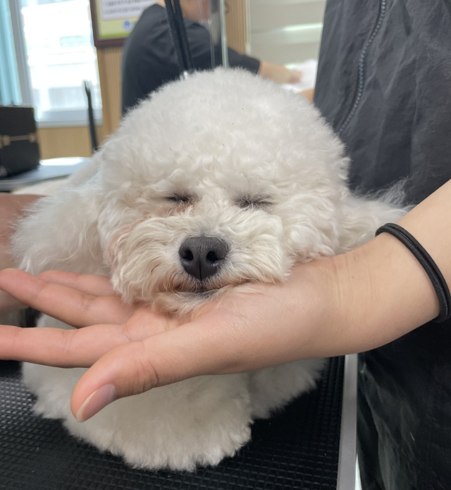 김지민 학생의 미용실습을 받으며 쿨쿨 잠자는 실습견. "손길이 부드럽다 멍멍!"