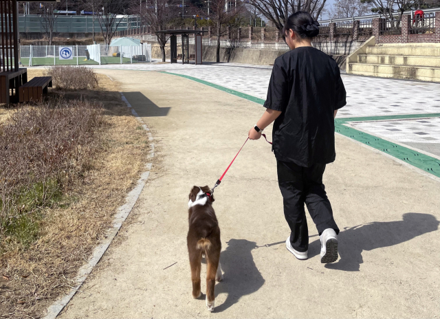 신하늘 학생이 쉬는시간을 이용해 실습견을 산책시키고 있다.