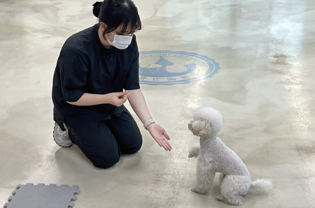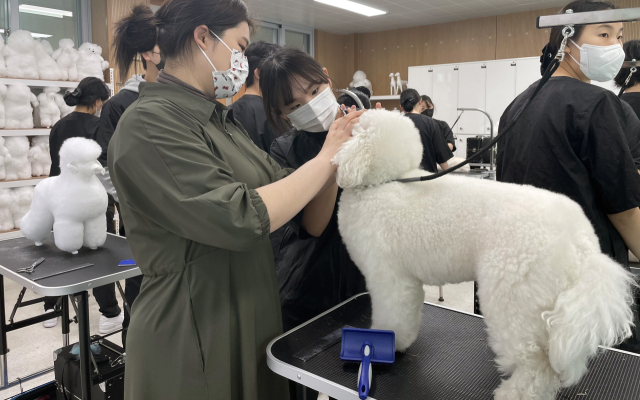 신하늘 학생이 미용 교사 윤호정 씨의 지도 아래 실습견 엘빈의 털을 다듬고 있다. 임소현 기자