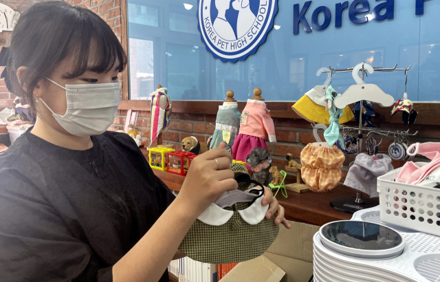 신하늘 학생이 펫패션 수업에서 자신이 만든 옷을 보여주고 있다. 임소현 기자