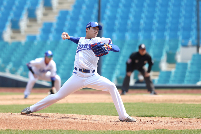 28일 대구삼성라이온즈파크에서 열린 삼성과 한화의 마지막 시범경기. 삼성 선발 원태인이 역투하고 있다. 삼성라이온즈 제공