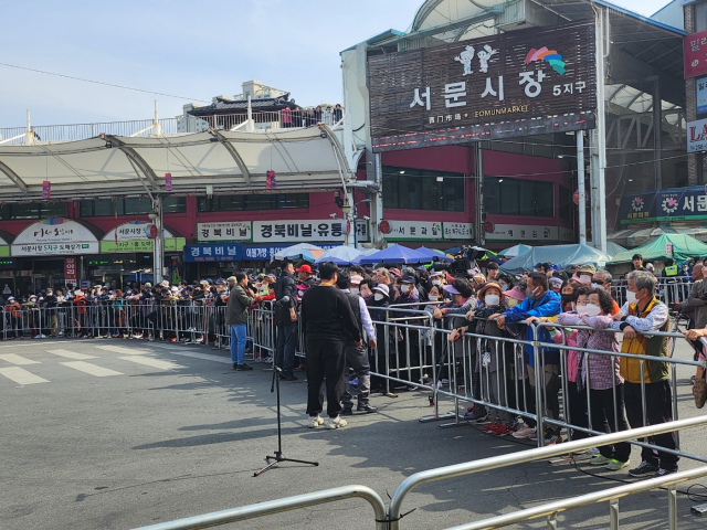 1일 대구 서문시장 100주년을 맞아 깜짝 방문한 윤석열 대통령과 김건희 여사를 보려는 시민들로 시장 입구가 북새통을 이루고 있다. 안전과 경호 상 설치된 안전 울타리에는 시민들이 발 디딜 틈 없이 몰려 들었다. 김주원 기자