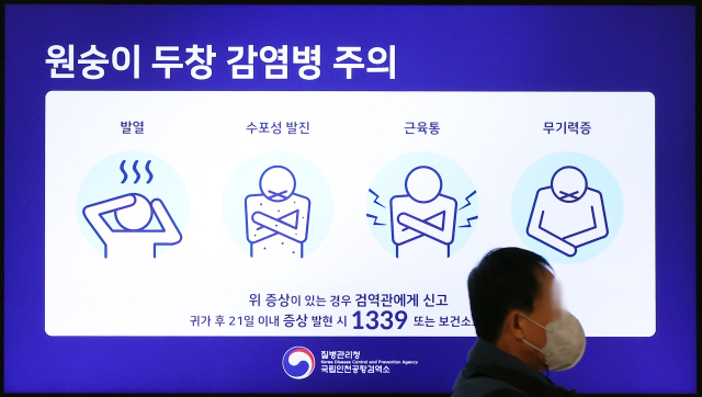 지난해 인천국제공항 1터미널 출국장 전광판에 원숭이 두창 감염에 대한 안내가 나오고 있다. 연합뉴스